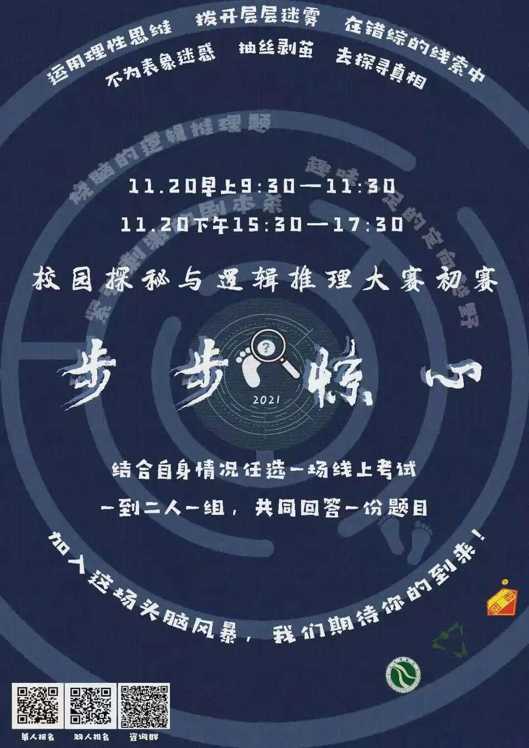 2021步步惊心校园探秘与逻辑推理大赛来了!这里有烧脑的逻辑推理题,趣味十足的定向越野,和紧张刺激的剧本杀,更有丰厚奖品等你来战。
