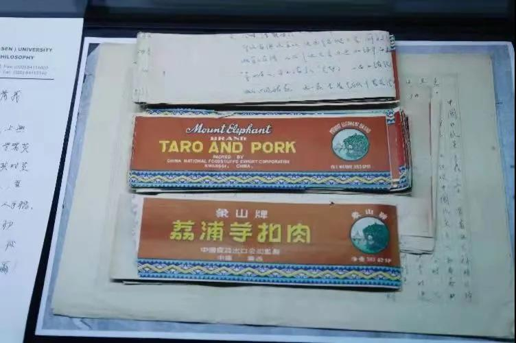 中文系黄天骥教授如今已是鹤发名师, 他于1964年撰写的《桃花扇》讲义也在展览之列。有趣的是,这份讲义撰写在整版的红色“荔浦芋扣肉”商标背面,起初被藏家当作老商标流通,还有被裁成一小条一小条的痕迹,后来才发现背面的字迹或更有文献价值。讲义并无署名,周春健老师几经询问,最后才确认是黄老师的讲义,而作者自己早已忘记了当年的情形。