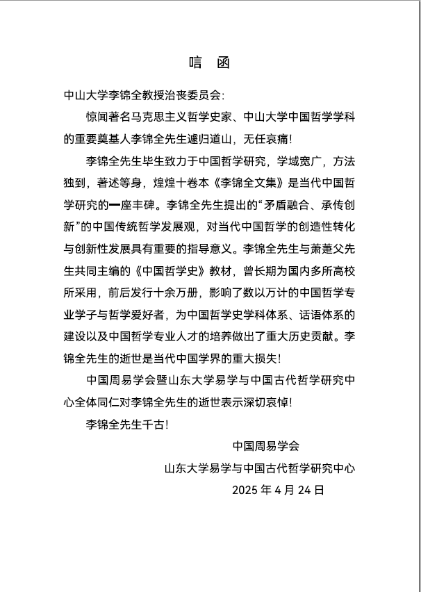 中国周易学会、山东大学易学与中国古代哲学研究中心唁电