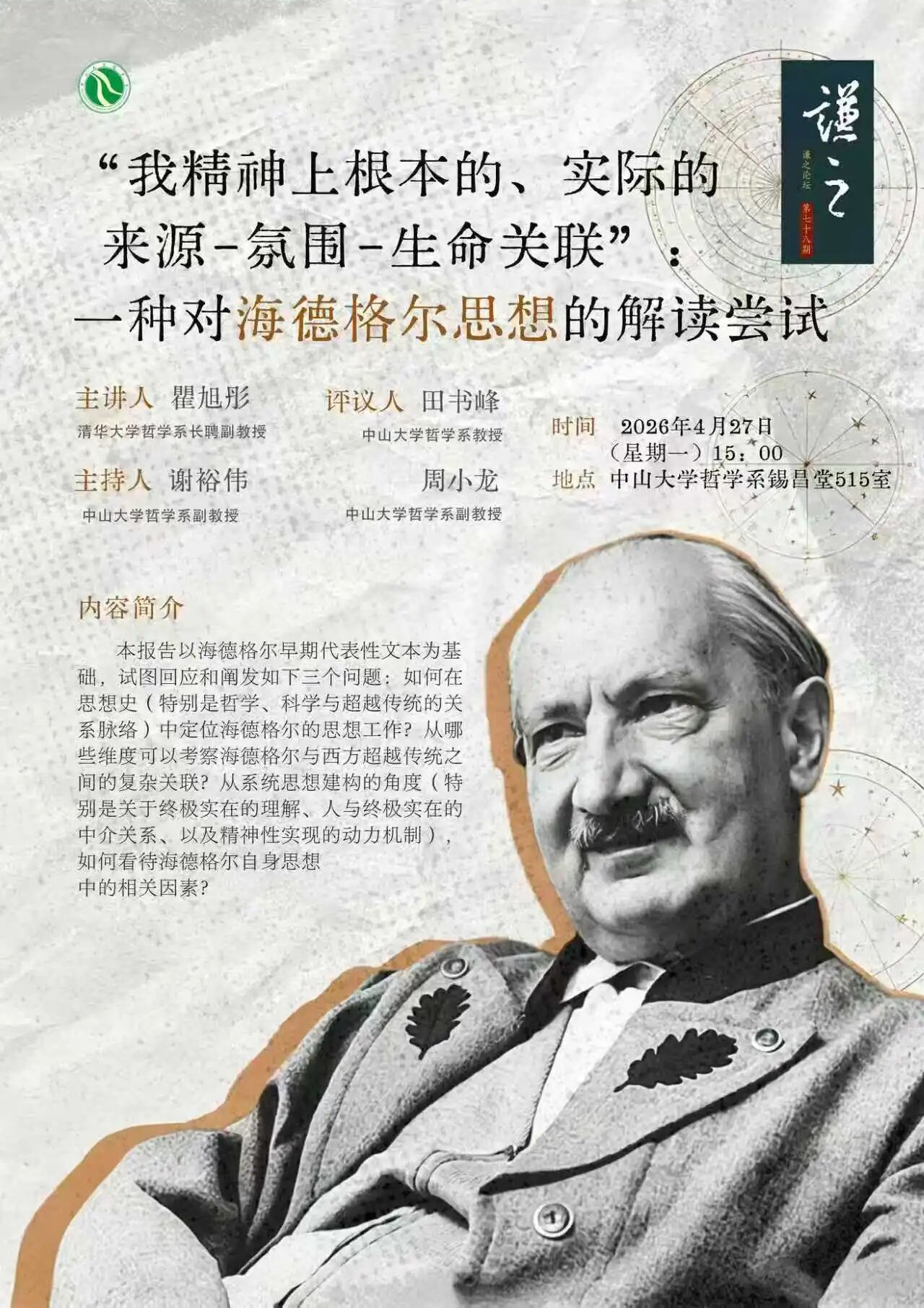 谦之论坛预告|瞿旭彤:“我精神上根本的、实际的来源-氛围-生命关联”:一种对海德格尔思想的解读尝试